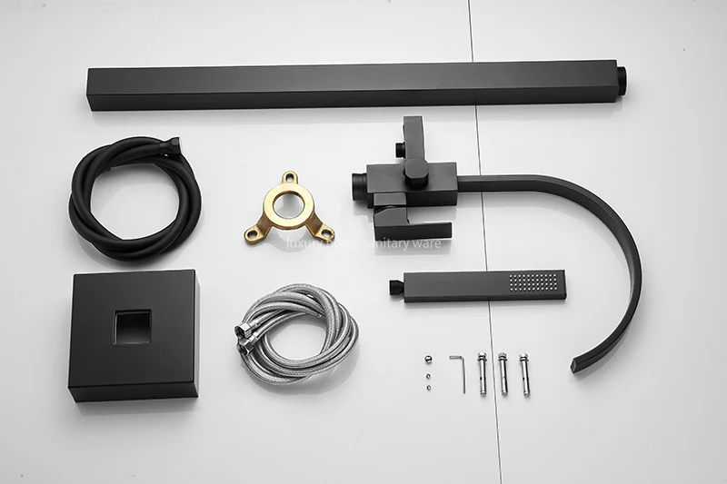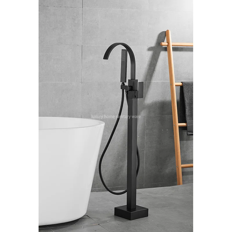 Introducing, the Luxury Home High-Quality Independent 360 Rotating Bathtub Floor Faucet in a sleek black design with a square flat elbow landing. This modern and stylish faucet is perfect for upgrading your bathroom and adding a touch of luxury to your home.