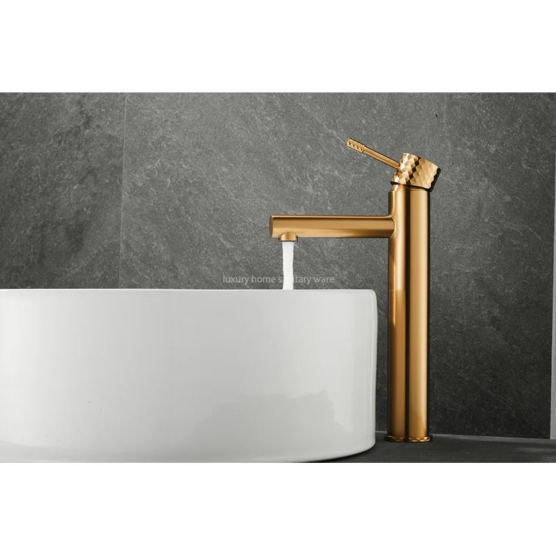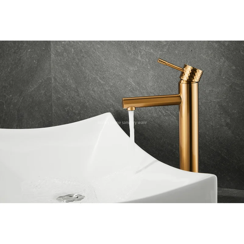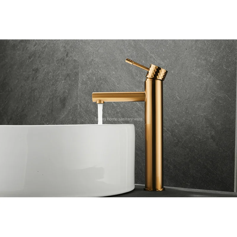 This exquisite Basin with High Straight Mouth-carved Handle-brushed Gold Bathroom Faucet Hot and Cold Mixer by Luxury Home is the perfect addition to any modern bathroom. With its sleek design and luxurious brushed gold finish, this faucet will instantly elevate the look of your space.